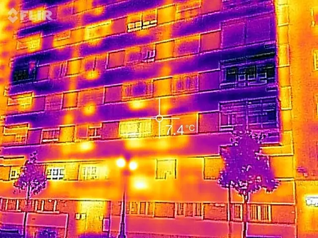 Fachadas exteriores: En estas fachadas de la edificación se colocó una Fachada Ventilada basada en piezas porcelánicas rectificadas con sustentación mediante grapa oculta a una estructura de montantes verticales sujetos a fachada. Los materiales y las soluciones de arranque, esquina, jambas, vierteaguas y coronación se resolviueron en algunos casos con piezas de composite. La misma solución se extenderá a la totalidad de esas fachadas, incluidos los paramentos de las mismas que han quedado incluidas dentro de las terrazas que han sido cerradas y los frentes de las mismas, aunque en este caso con un menor espesor de aislamiento para reducir la pérdida de espacio. También se procede a aislar puntos muy singulares como la parte inferior de los vuelos o los petos superiores de las fachadas.