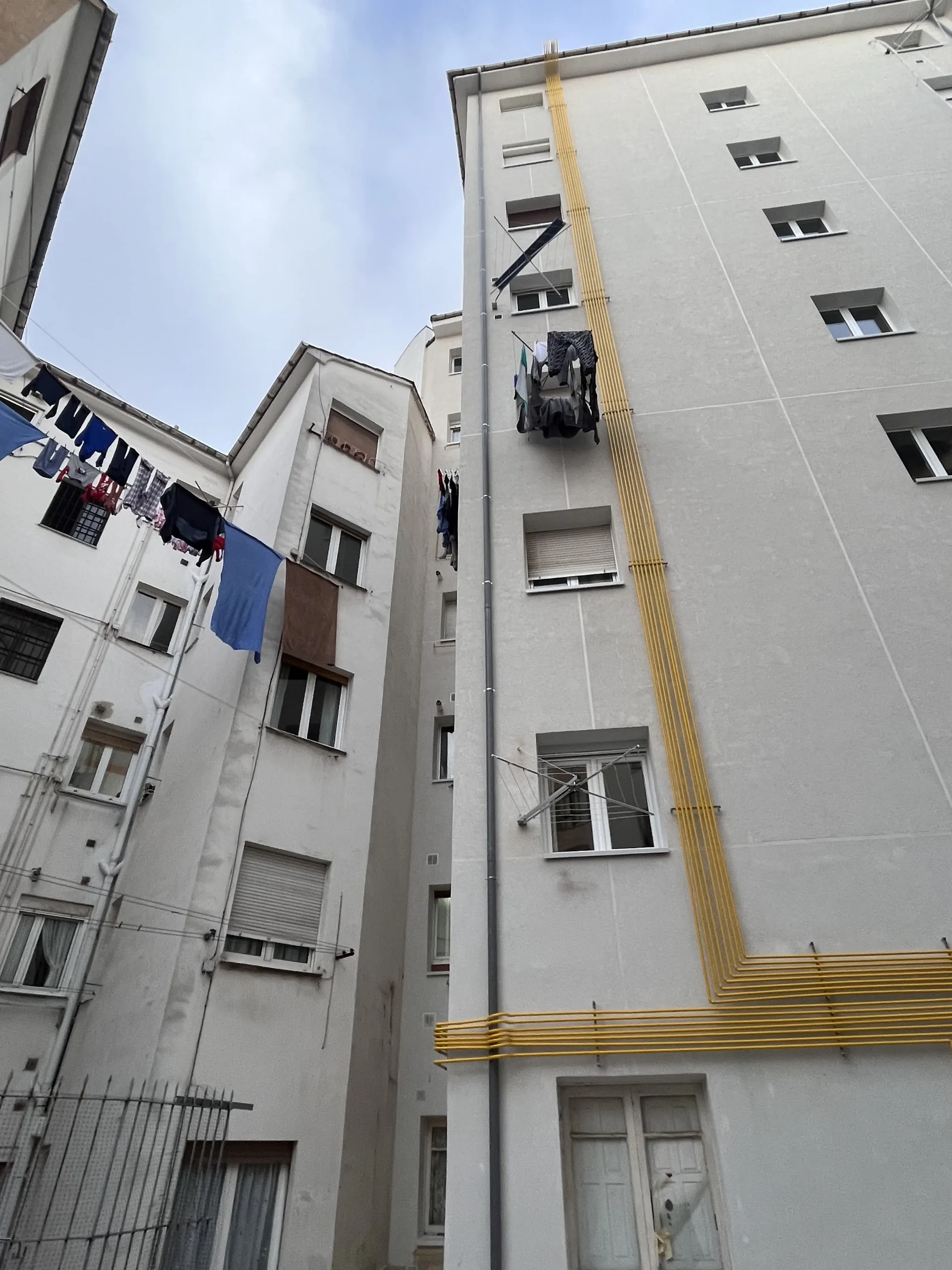 Para las fachadas de los patios se opta por un sistema de aislamiento térmico exterior (SATE), que consistirá en colocar un sistema de aislamiento térmico exterior constituido a base de placas aislantes de poliestireno (EPS), de 8cm. de espesor, previo saneado de las mismas. Estos paneles serán fijados al paramento existente con espigas y mortero especial de agarre, y llevarán una capa externa de mortero con armadura más el acabado definitivo, que en este caso será de color blanco para mantener la luminosidad en estos espacios.
