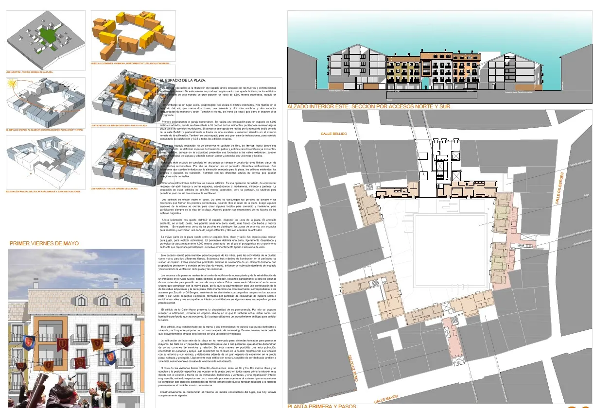 Todo ese espacio rescatado ha de conservar el carácter de libre, de ‘hortus’ hasta donde sea posible. Por ello se definirán espacios de transición, patios y jardines para los edificios ya existentes. Estos edificios, aunque en la actualidad presentan sus fachadas a las calles exteriores, pueden también participar de la plaza y además sanear, airear y potenciar sus viviendas y locales. Para que este espacio se convierta en una plaza es necesario dotarla de unos límites claros, de unos bordes reconocibles. Por ello se disponen en el perímetro diferentes edificaciones. Son volúmenes que quedan limitados por la alineación marcada para la plaza, los edificios existentes, los jardines y espacios de transición. También con las diferentes alturas de cornisa que quedan recogidas en la normativa.